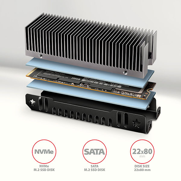Vďaka svojej celkovej výške 24 mm a chladiču s výškou 20 mm je možné chladič umiestniť aj do skrinky s obmedzeným priestorom. Priečne rebrá hliníkového chladiča a kovový rám optimalizujú odvod tepla z M.2 SSD, čo dokáže znížiť teplotu disku až o 30 °C. To predlžuje životnosť SSD a zabraňuje spomaleniu rýchlosti disku, takzvanému "tepelnému škrteniu".