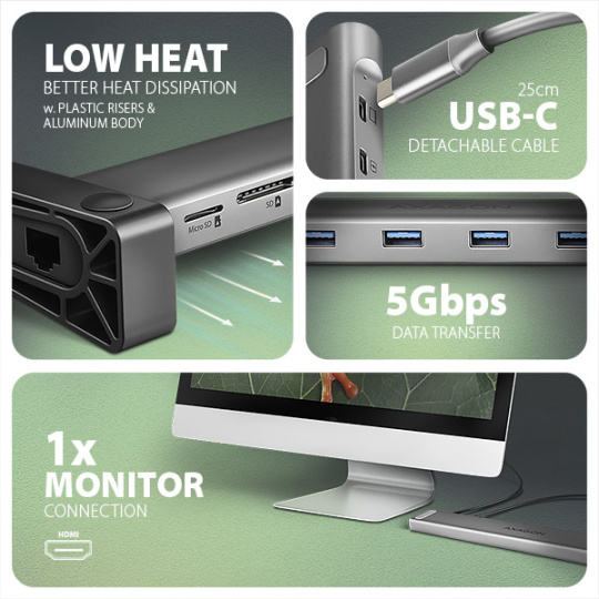 Multiportový hub AXAGON HMC-10HLS LONGER 9v1 USB-C 5Gbps rozšíri váš notebook, počítač alebo telefón o deväť portov. Prostredníctvom obojstranného konektora USB-C ľahko a rýchlo pripojíte k počítaču monitor, štyri zariadenia USB, sieť Gigabit Ethernet a čítačku kariet SD. Zároveň získate možnosť napájania notebooku pomocou technológie Power Delivery. Replikátor portov vám poskytne jednoduchú a kompaktnú dokovaciu stanicu 9 v 1 nielen pre notebooky so systémom Windows, ale aj pre notebooky Apple ako MacBook Air alebo MacBook Pro.