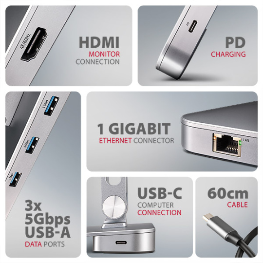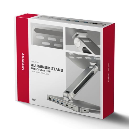 AXAGON HMC-STND 7v1 Hub & Stand je unikátny multifunkčný rozbočovač integrovaný do stojana na notebook alebo tablet. Tento rozbočovač rozšíri váš notebook alebo tablet o ďalších šesť portov. Pripojte svoj notebook k rozbočovaču pomocou 60 cm dlhého kábla USB-C USB-C. Okamžite máte pripojenie pre monitor, tri USB zariadenia, konektor RJ-45 pre sieť Gigabit Ethernet a napájanie notebooku pomocou technológie Power Delivery. Stojan s dvoma kĺbmi zlepšuje ergonómiu a pohodlie pri práci a je vhodný pre zariadenia od 10" do 17.3". Je ideálny ako dokovacia stanica 7 v 1 pre notebooky so systémom Windows a Apple MacBook Air alebo MacBook Pro.