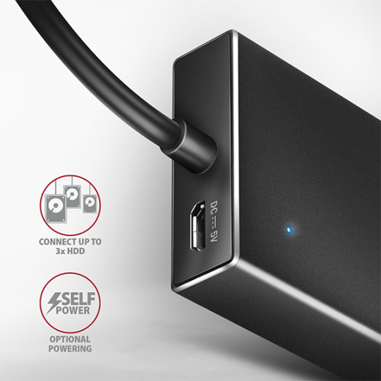 Všestrannosť tohto USB rozbočovača umocňuje vstavaný micro USB konektor pre dodatočné napájanie zo štandardných USB nabíjačiek dodávaných s mobilnými telefónmi. S týmto dodatočným napájaním môžete napríklad pripojiť k počítaču ešte viac externých diskov alebo zvýšiť počet mobilných telefónov, ktoré môžete nabíjať. Zvládne trvalé pripojenie viacerých externých diskov aj bez externého napájania do hubu. Po pripojení externého zdroja napájania môžete pracovať s piatimi externými jednotkami súčasne.