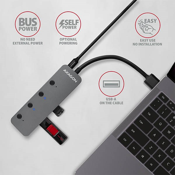 AXAGON HUE-MSA, 4x USB 3.rozbočovač 2 Gen 1 SWITCH, kovový, napájanie micro USB. konektor, kábel USB-A 20 cm