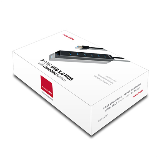 7-portový USB 3.0 hub AXAGON HUE-SA7BP ALU CHARGING s vlastným zdrojom napájania a podporou rýchleho nabíjania na všetkých portoch USB. Kompaktný rozbočovač s odolným hliníkovým puzdrom pripojí k počítaču až sedem zariadení USB súčasne. Pevný USB kábel s dostatočnou dĺžkou 40 cm ideálny na použitie s notebookmi.