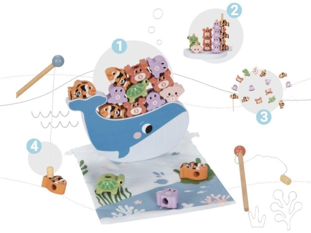 Súbor hier Rybky 4v1 sa skladá zo 4 obľúbených detských hier, ako sú balančná hra, drevená nasadzovacia hra, navliekanie a rybolov, so spoločnou tématikou - oceánom, morskými živočíchmi. Všetky tieto hry sú vyrobené z prírodného dreva a sú zárukou veľkej zábavy, ktorá prirodzeným spôsobom rozvíja detské zručnosti. Morským motívom aj farbami je sada hier 4v1 vhodná pre dievčatká aj chlapcov.