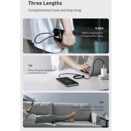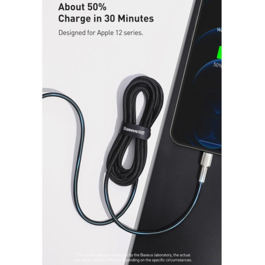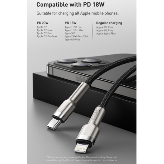 Kábel BASEUS Cafule Metal Series je odolný kábel, ktorého koncovky sú potiahnuté zliatinou zinku, aby vydržali dlhé a náročné používanie. Výrobok je tiež vybavený špeciálnym nylonovým opletením, ktoré zabraňuje treniu a chráni káble vo vnútri. Zlepšila sa aj odolnosť konektorov - boli testované na 10 000 spojení a boli špeciálne profilované tak, aby sa kábel dal používať aj vtedy, keď je telefón v puzdre. Kábel má funkciu rýchleho nabíjania a prenosu dát PD 20 W. Jeho dĺžka je 200 cm.