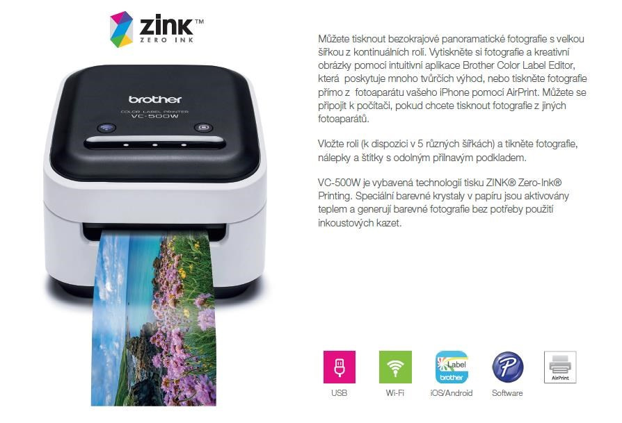 tlačiareň VC-500W je vybavená technológiou tlače ZINK® Zero-Ink®. Špeciálne farebné kryštály v papieri sa aktivujú teplom a vytvárajú farebné fotografie bez potreby atramentových kaziet.