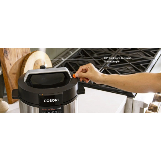 Tlačidlo Seal/Vent je umiestnené mimo ventil na vypúšťanie pary, zatiaľ čo ovládač na vypúšťanie pary je umiestnený o 30° vzadu, čo zabezpečuje bezpečné a jednoduché odvetranie. Tlakový hrniec Cosori Multicooker CMC je vybavený dvojvrstvovým vekom proti opaľovaniu a ochranou proti prehriatiu pre väčšiu bezpečnosť