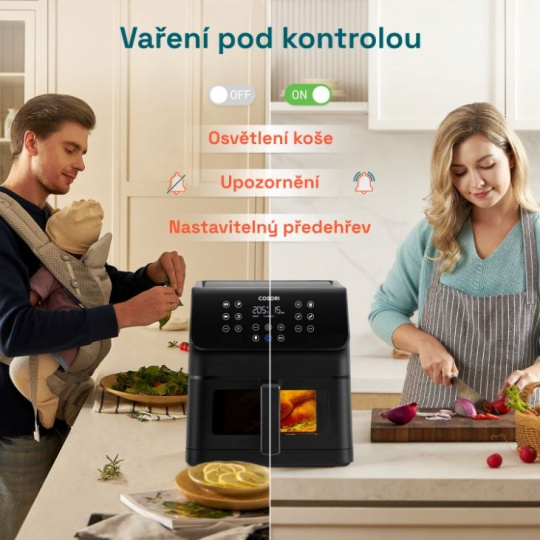 Teplovzdušná fritéza Cosori Premium II Plus má 6,2l kôš s praktickým štvorcovým tvarom, vďaka ktorému je vhodná pre väčšie domácnosti. Nádoba má navyše okienko, takže môžete sledovať proces prípravy bez toho, aby ste museli fritézu otvárať. Vďaka tomu bude už aj tak rýchla príprava ešte rýchlejšia.
