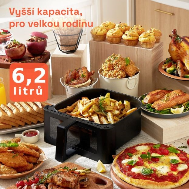 - Veľký 6,2-litrový kôš pri zachovaní kompaktnosti fritézy pre malé priestory
