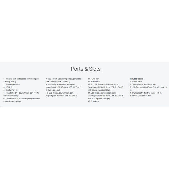 • 1 x ThunderboltTM 4 downstream port (15 W) pre daisy chaining (Video + dáta)