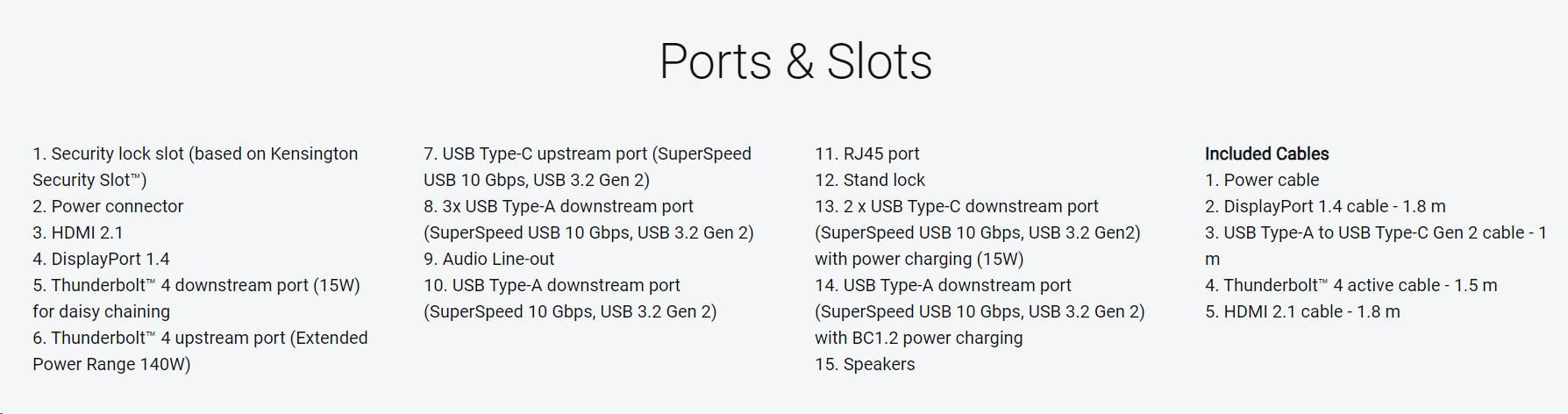 • 1 x ThunderboltTM 4 (Až 140W EPR) (Alternatívny režim s DisplayPort 1.4, SuperSpeed USB 3.2 Gen2 (10 Gbps) upstream port, USB Power Delivery až 140W EPR)