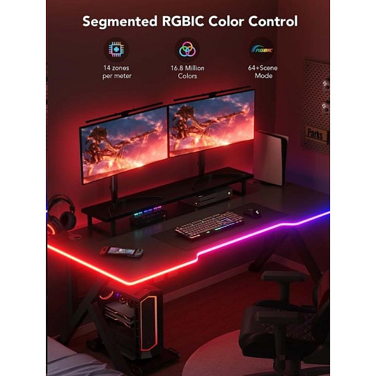 Vylepšite svoje herné, filmové a hudobné zážitky s dizajnovým tvarovateľným svetelným pásom na písací stôl - Govee Neon Gaming Table Light. Je energeticky úsporný s životnosťou až 50.000 hodín. Vďaka technológii RGBIC zobrazuje tento neonový svetelný pás až 57 farieb naraz a celkovo vie zobraziť až 16 miliónov farieb s intenzitou v rozmedzí 1-100%. Určite si vyberiete z viac ako 64 režimov osvetlenia a pri pozeraní obľúbenej hudby si môžete zvoliť tiež z 11 rytmických režimov. Svetlá sa ovládajú hlasom cez Siri, Amazon Alexa alebo Google Assistant alebo cez aplikáciu Govee Home na vašom smartfóne/tablete. Svetelný pás má celkovú dĺžku 3 metre, je určený na inštaláciu na rôzne typy stolov a jeho tvar si môžete upraviť podľa vlastnej fantázie. Inštalácia je veľmi jednoduchá bez vrtania pomocou 3M pásky.
