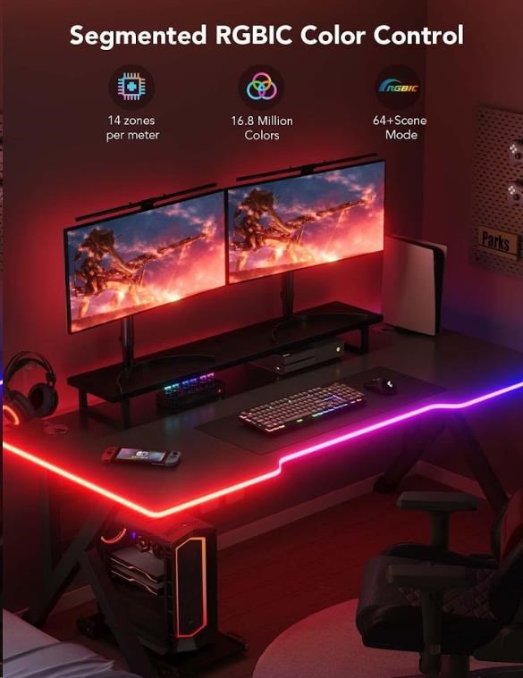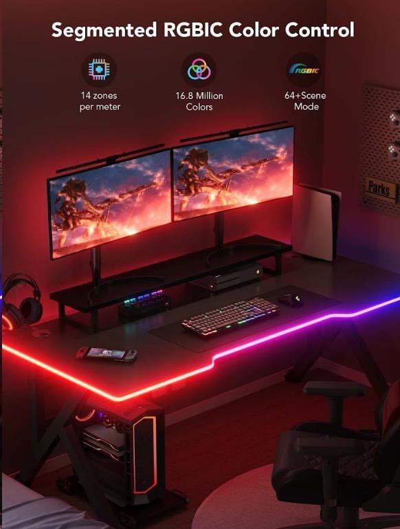 Vylepšite svoje herné, filmové a hudobné zážitky s dizajnovým tvarovateľným svetelným pásom na písací stôl - Govee Neon Gaming Table Light. Je energeticky úsporný s životnosťou až 50.000 hodín. Vďaka technológii RGBIC zobrazuje tento neonový svetelný pás až 57 farieb naraz a celkovo vie zobraziť až 16 miliónov farieb s intenzitou v rozmedzí 1-100%. Určite si vyberiete z viac ako 64 režimov osvetlenia a pri pozeraní obľúbenej hudby si môžete zvoliť tiež z 11 rytmických režimov. Svetlá sa ovládajú hlasom cez Siri, Amazon Alexa alebo Google Assistant alebo cez aplikáciu Govee Home na vašom smartfóne/tablete. Svetelný pás má celkovú dĺžku 3 metre, je určený na inštaláciu na rôzne typy stolov a jeho tvar si môžete upraviť podľa vlastnej fantázie. Inštalácia je veľmi jednoduchá bez vrtania pomocou 3M pásky.