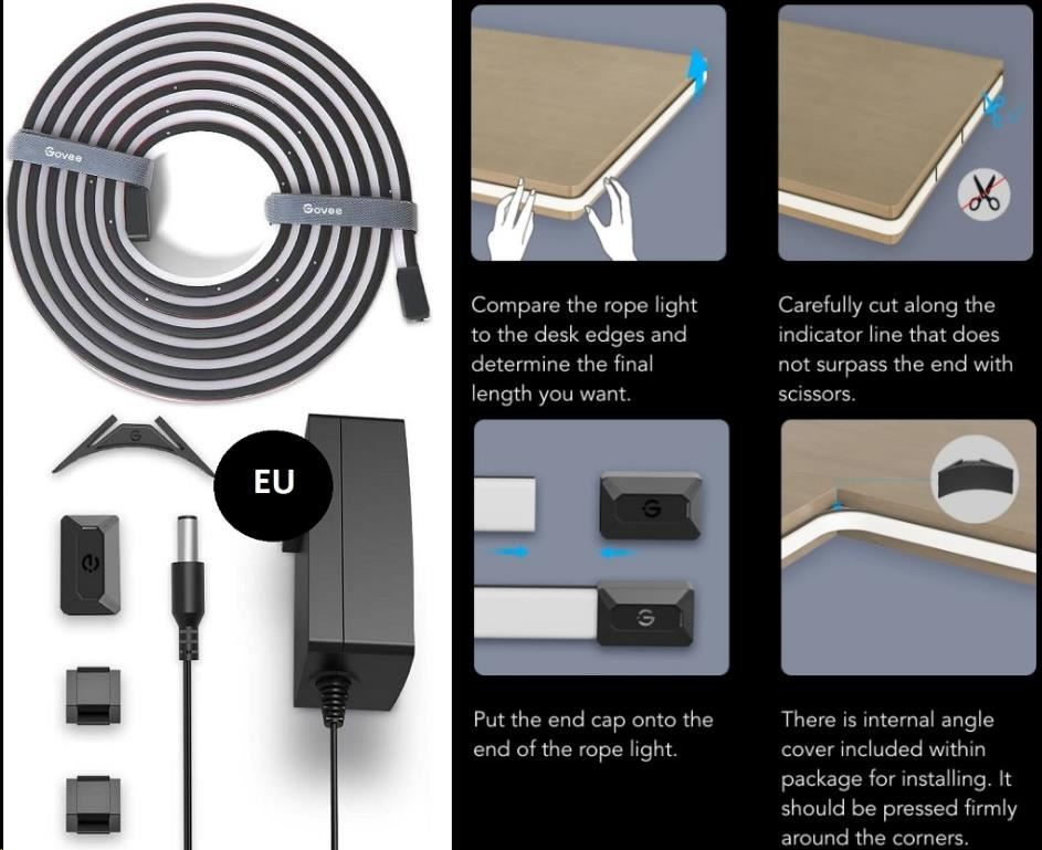 Inštalácia je veľmi jednoduchá pomocou 3M pásky. Govee Neon je pružný a ohybný pás, ktorý môžete tvarovať podľa tvaru svojho stola. V balení sú tiež spony na inštaláciu na stôl v tvare L alebo s pravými uhlami. Celková dĺžka je 3 metre a na páske sú značky, kde možno pások skrátiť jednoduchým prestrihnutím. Neorezávajte pás mimo označené body určené na to, poškodia sa kontakty a páska.