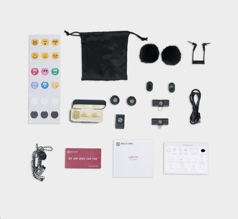 LARK M2 je dodávaný so sadou užitočného príslušenstva vrátane veterných krytov pre nahrávanie vonku, káblových konektorov pre jednoduché pripojenie a špeciálneho náhrdelníka pre každý TX. S týmto príslušenstvom budete mať všetko, čo potrebujete k nastaveniu zariadenia LARK M2 a využívaniu jeho funkcií.