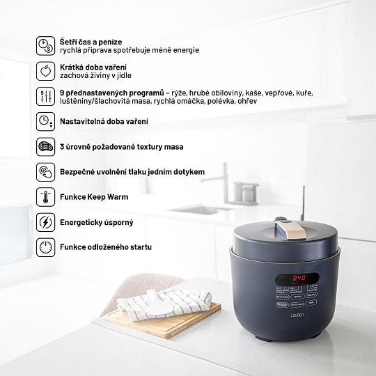 Viacúčelový a energeticky úsporný elektrický tlakový hrniec Lauben Electric Pressure Cooker 5000AT vie vďaka tlaku vo vnútri pripraviť chutné pokrmy za rekordne krátku dobu. Čas, ktorý ušetríte, tak môžete venovať sebe či rodine. Zároveň ušetríte aj peniaze, pretože spotreba energie je pri tomto spôsobe varenia nižšia. Kratšia príprava prospieva aj surovinám, ktoré si uchovávajú viac živín. Stačí pritom jediné, vložiť všetko potrebné do hrnca, zavrieť, zapnúť a o všetko ostatné sa už prístroj postará sám.