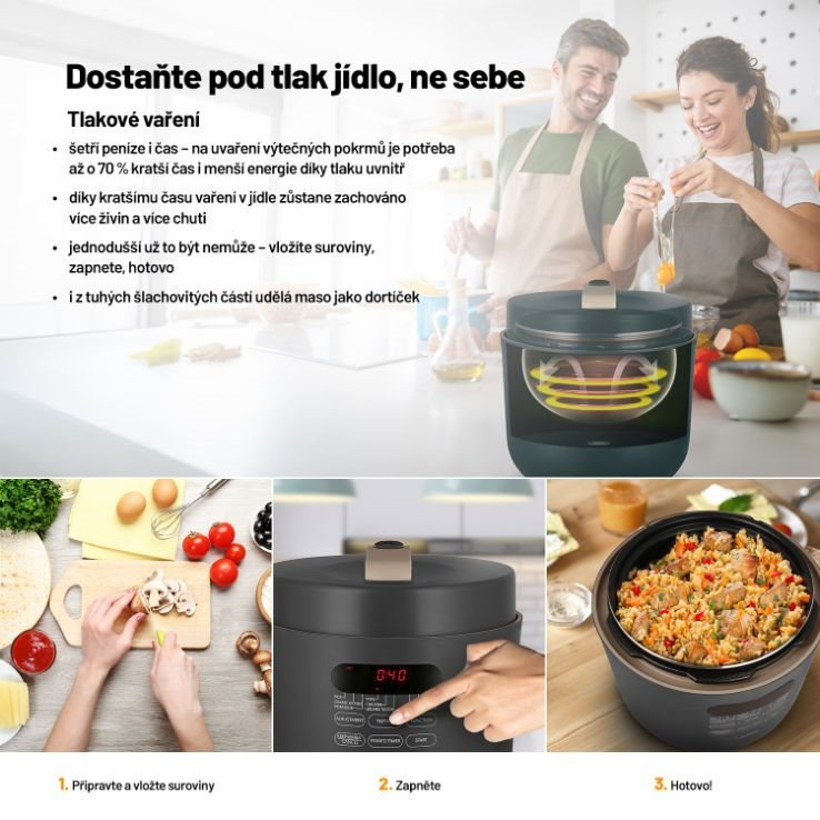 Keď mu zvýšite tlak, ušetríte časTlakové hrnce bývali vždy vítanými, ale tiež obávanými spoločníkmi v domácnosti. Energeticky úsporný viacúčelový elektrický tlakový hrniec Lauben Electric Pressure Cooker 5000AT má všetky výhody tzv. papiňáka a ešte niečo naviac a v modernom a bezpečnom šate. Čas aj peniaze šetrí kratšia doba prípravy vďaka tlaku vo vnútri a navyše sa takto zachová v jedle viac živín. Aj keď nie ste kuchársky majster, obľúbite si fakt, že do hrnca stačí dať suroviny, zapnúť ho a on sa o všetko postará. Hrniec disponuje 9 prednastavenými programami a 3 úrovňami požadovanej štruktúry mäsa. Čas prípravy nastavíte aj manuálne. 5l objem stačí pre celú rodinu, údržba je jednoduchá, bezpečnosť zaisťuje One Touch ventil pre vypustenie tlaku. Jedlo udrží teplé funkcia Keep Warm, lepšie plánovanie umožní odložený štart. Balenie obsahuje tiež kuchárku.