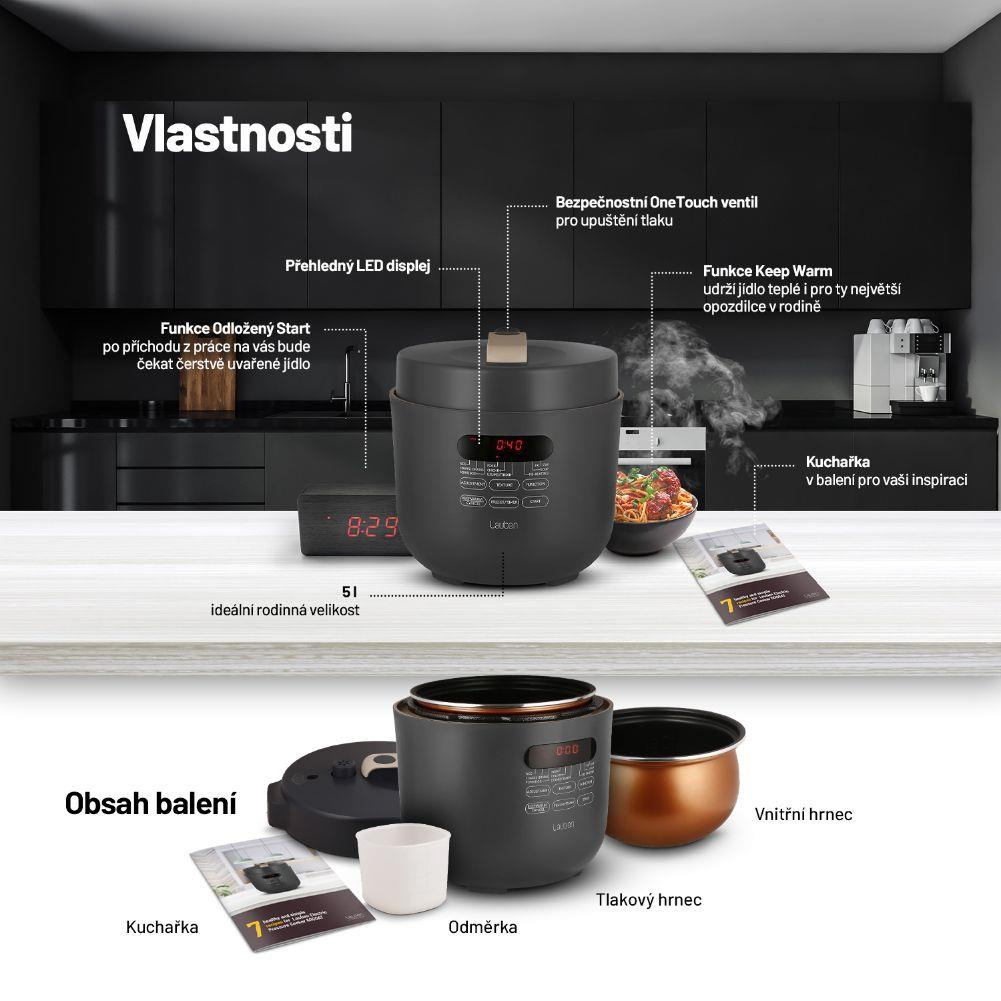 Viacúčelový a energeticky úsporný elektrický tlakový hrniec Lauben Electric Pressure Cooker 5000AT vie vďaka tlaku vo vnútri pripraviť chutné pokrmy za rekordne krátku dobu. Čas, ktorý ušetríte, tak môžete venovať sebe či rodine. Zároveň ušetríte aj peniaze, pretože spotreba energie je pri tomto spôsobe varenia nižšia. Kratšia príprava prospieva aj surovinám, ktoré si uchovávajú viac živín. Stačí pritom jediné, vložiť všetko potrebné do hrnca, zavrieť, zapnúť a o všetko ostatné sa už prístroj postará sám.