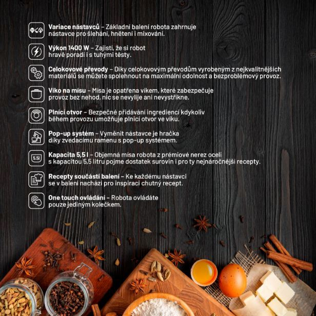 Šéf kuchyne, ktorý vám uľahčí prácuVarenie a pečenie sa stane ešte väčšou zábavou, s viacúčelovým kuchynským robotom Lauben Kitchen Machine 550BC s výkonom 1400 W všetko zvládnete ľahko a rýchlo. Netreba sa báť ani prípravy tuhšieho cesta, celokovové prevody si s vysokou záťažou poradia. Misa s objemom 5,5 l z nerezovej ocele pojme skutočne veľa a veko bráni úniku obsahu pri spracovaní. Suroviny je možné počas prevádzky pridávať cez plniacu otvor vo veku. Pri všetkom, čo dokáže, je robot menších rozmerov a nezaberie tak na linke príliš miesta. Svojim dizajnom ju však bude aj zdobiť. Prístroj pohodlne ovládate jednou rukou vďaka One Touch systému, manipuláciu uľahčuje tiež Pop-up systém slúžiaci k výmene nadstavcov. Robot disponuje hneď niekoľkými nadstavcami, pre miešanie, šľahanie či miesenie a ku každému z nich nájdete v balení chutný recept na inšpiráciu.