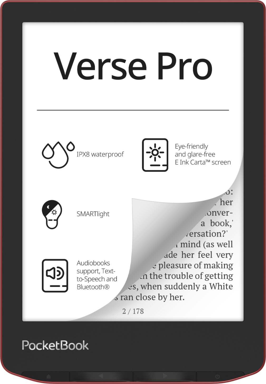 PocketBook Verse Pro spĺňa normu IPX8, takže je možné ju ponoriť do až 2 m pitnej vody na 60 minút.