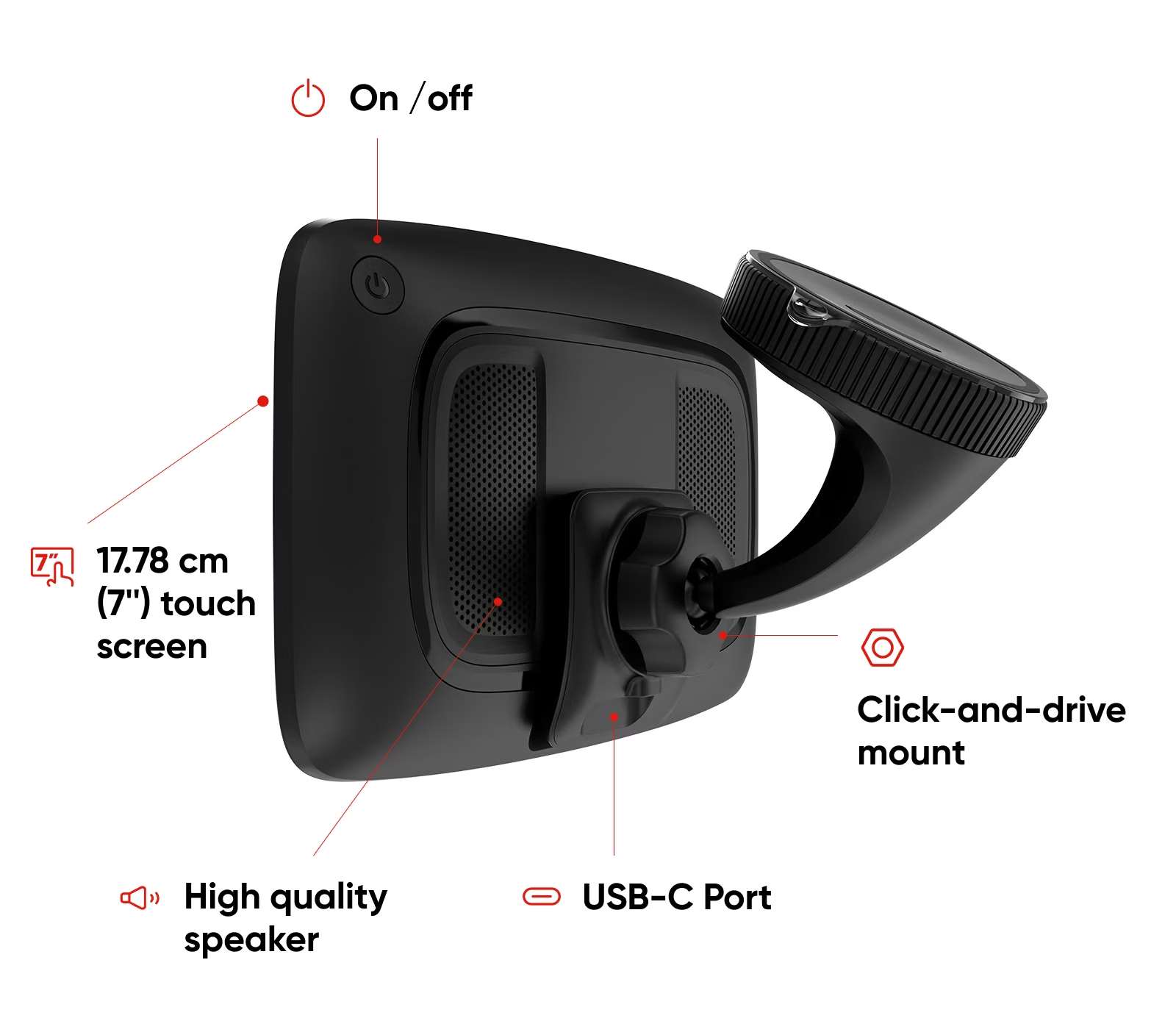 Na 7" dotykovej obrazovke si môžete prezrieť svoju trasu vo vysokých detailoch. A vďaka ovládaniu pomocou hlasových príkazov môžete zariadenie GO Camper Max ovládať, bez toho aby ste museli zložiť ruky z volantu. Ľahko použiteľný držiak Click-and-Drive navyše drží navigačné zariadenie bezpečne na mieste.