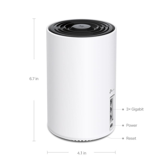| WiFi Range | 4-7+ Bedroom Houses (3-pack) 3-5 Bedroom Houses (2-pack) 1-3 Bedroom Houses (1-pack) TP-Link Mesh Technology Optional Ethernet backhaul work together to link Deco units to provide seamless coverage AI-Driven Mesh Intelligently learns the network environment to provide ideal Wi-Fi unique to your home 4× High-Gain Antennas (Internal) Multiple antennas form a signal-boosting array to cover more directions and large areas Tri-Band A newly-opened 6 GHz band brings more bandwidth and faster speeds Beamforming Concentrates wireless signal strength towards clients to expand WiFi range |