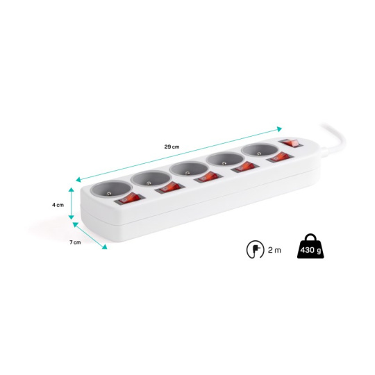 Prodlužovací káblový prívod na 230 V je vybavený hlavným sieťovým vypínačom, ktorý pri vypnutí úplne odpojí od prívodu elektrickej energie všetky zapojené spotrebiče naraz. Prodlužovací kábel tiež disponuje vypínačmi pre každú zásuvku zvlášť, sami si zvolíte, ktoré zásuvky budú kedy zapnuté alebo vypnuté bez potreby odpojenia pripojovacieho kábla od elektrospotrebiča. Extra výbavou je detská ochrana všetkých zásuviek – zásuvky sú prístupné iba v prípade zasunutia oboch vidlíc naraz, teda nie je možné zasunúť jednotlivé, napríklad skrutkovač alebo pletacia ihlica. Vďaka pootočeniu zásuviek o 45° je možné používať aj objemnejšie napájacie adaptéry alebo uhlové koncovky.