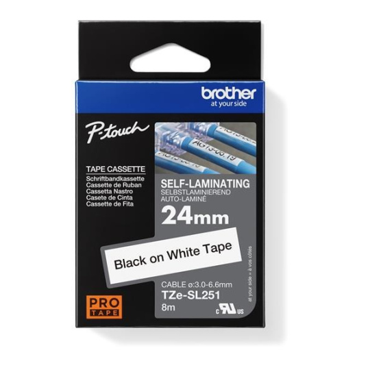 Samolepiaca páska TZe-SL251 s dĺžkou 24 mm s čiernym tlačením na biele bola vyvinutá na dlhodobú identifikáciu sieťových káblov. Má špeciálne lepiace vlastnosti štítkov pre trvácne pevné obtočenie okolo vašich vodičov a káblov. Kompatibilná s niektorými modelmi P-touch, ktoré používajú pásky TZe 24 mm a 36 mm.