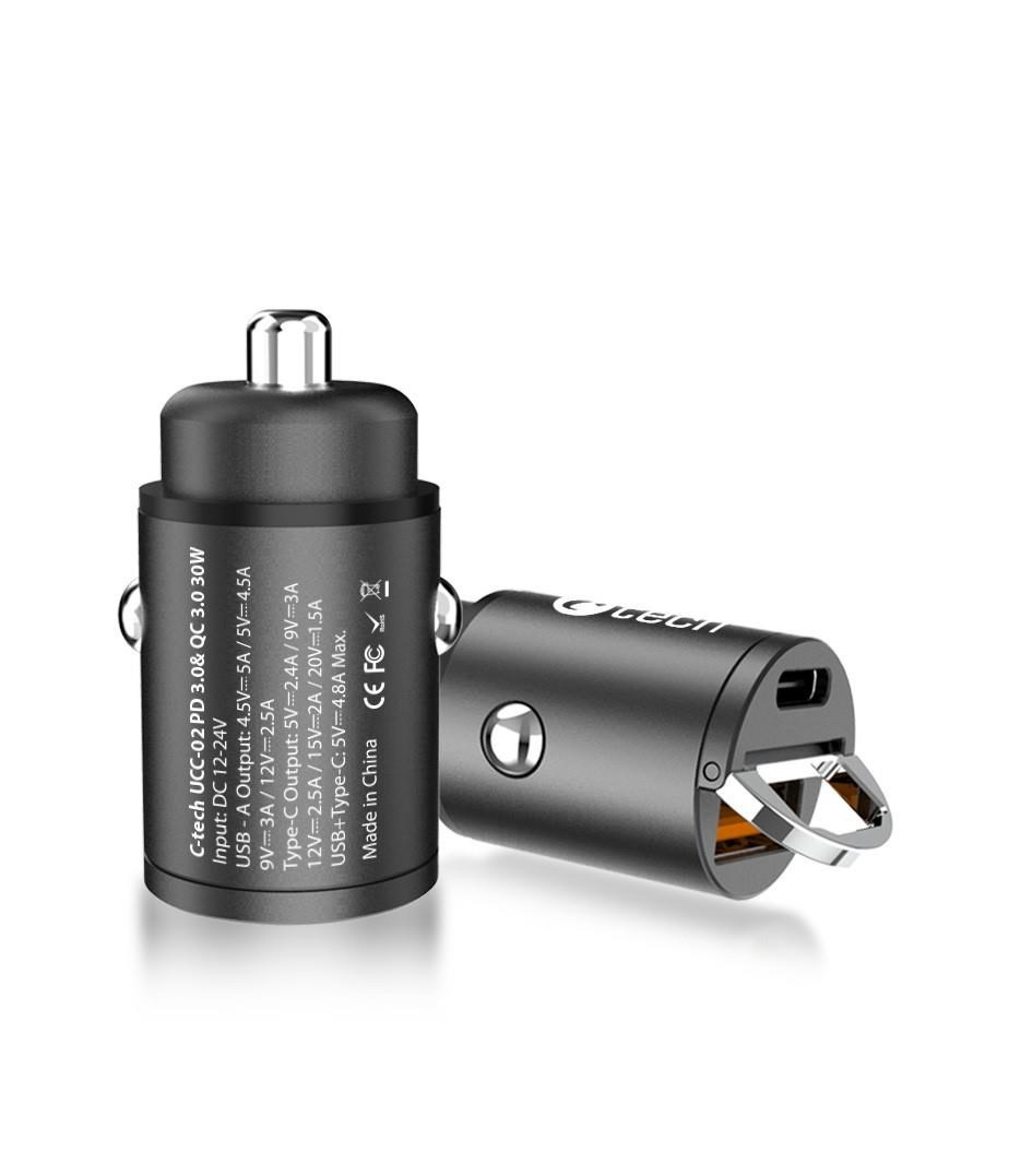 Miniatúrna nabíjačka do auta C-tech UCC-02 s podporou mnohých technológií rýchleho nabíjania sa postará o rýchle nabitie tabletu alebo telefónu. Ponúka vám celkom 2 výstupy typu USB-A a USB-C s celkovým výkonom 30W. Táto malá nabíjačka podporuje moderné technológie rýchleho nabíjania Power Delivery 3.0, Quick Charge (QC 3.0 + QC 2.0) a rad ďalších štandardov rýchleho nabíjania. Nabíjačku je možné použiť v osobných a dodávkových vozidlách s napätím 12 V, ale aj v veľkých nákladných automobiloch s 24V zásuvkou. Inteligentný čip dokáže rozpoznať nabíjané zariadenie a prispôsobiť tak potrebné napätie, čím šetrí energiu a zároveň chráni batériu. Nabíjačka C-tech UCC-02 je vybavená 5-násobnou ochranou, čím ochráni vaše digitálne zariadenia pred prepätím, podpätím, preťažením siete, skratmi aj vysokými teplotami. Telo nabíjačky je vyrobené z hliníku a je opatrené štýlovým čiernym povrchom - dokonale tak splynie s väčšinou interiérov. Minatúrne rozmery 73mm x 33mm a nízka hmotnosť robia z nabíjačky ľahko prenosný doplnok, môžete ju mať stále pri sebe a využívať jej kvality prakticky v každom automobile. Skladaný úchyt na vrchnej strane nabíjačky uľahčuje jej vytiahnutie zo zásuvky.