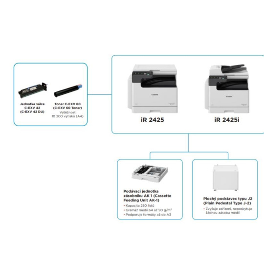 | Prídavný podávač papiera AK1 | Kapacita papiera: 1×250 listov (80 g/m2) Typ papiera: bežný, recyklované, farebné, perforované Veľkosť papiera: A3, A4, A4R, A5, B4, B5, B5R Hmotnosť papiera: 64 až 90 g/m2 Zdroj napájania: z hlavnej jednotky Rozmery (š × h × v): 581 × 575 × 92 mm Hmotnosť: cca,8 kg |