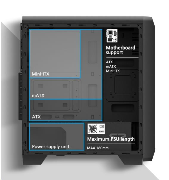 | Podpora základnej dosky | ATX, mATX, Mini-ITX |