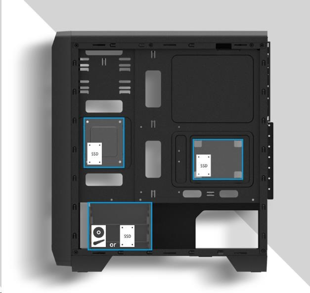 | Umiestnenie ventilátorov | Vpredu: 120mm x 3 Horná: 120mm x 2 Vzad: 120mm x 1 Dole: 120mm x 2 |