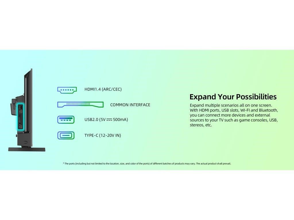 Vstupy a výstupy: USB-C, AV vstup mini, CI+, slúchadlový vstup 3.5 mm, digitálny audio výstup, HDMI 1.4, ARC CEC, USB 2.0, LAN, antény RF a LNB