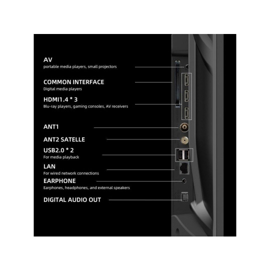 | Vstupy a výstupy: | AV vstup mini, CI+, digitálny audio výstup, HDMI 2.1, USB 2.0, LAN, antény RF a LNB |