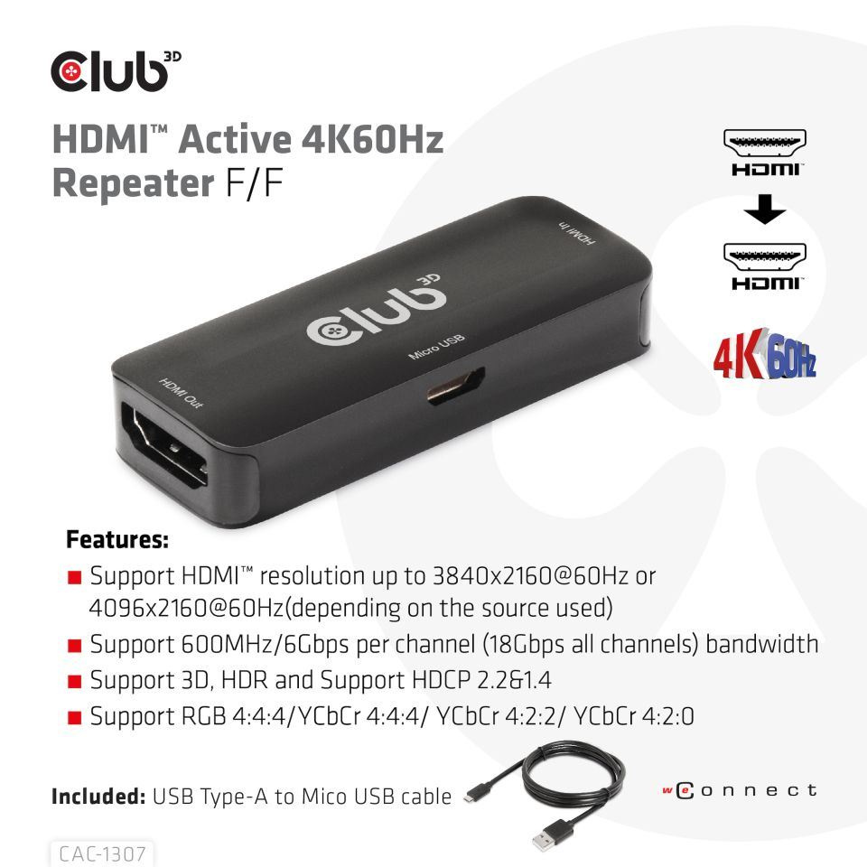 Club3D Adaptér aktivní HDMI 4K60Hz (F/F), černá