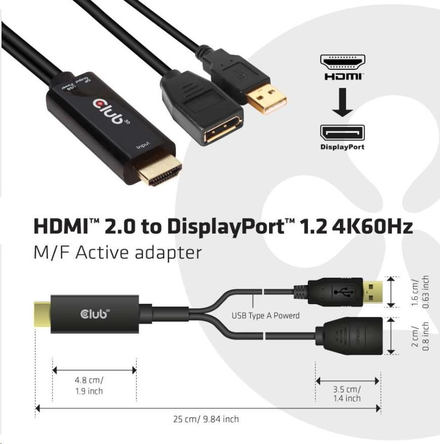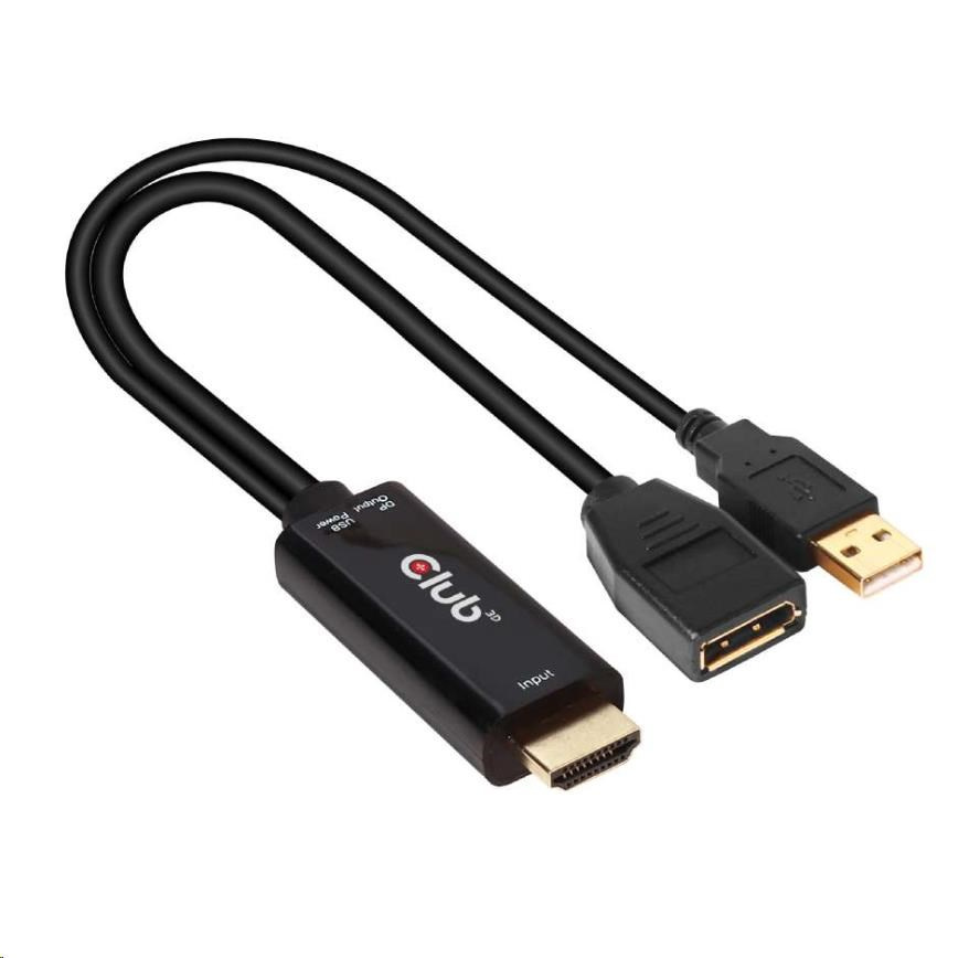 Club 3D CAC-1331 je HDMI™ na DisplayPort™ 1.2 Aktívny adaptér, ktorý umožňuje prenášať signál HDMI™ na signál DisplayPort™. Tento produkt podporuje DP1.2 s rozlíšením až 4096 x 2160@60 Hz. Okrem toho je vybavený portom USB typu A na napájanie v prípade, že zdroj HDMI™ nemá dostatok energie. Tento adaptér je jednosmerný.