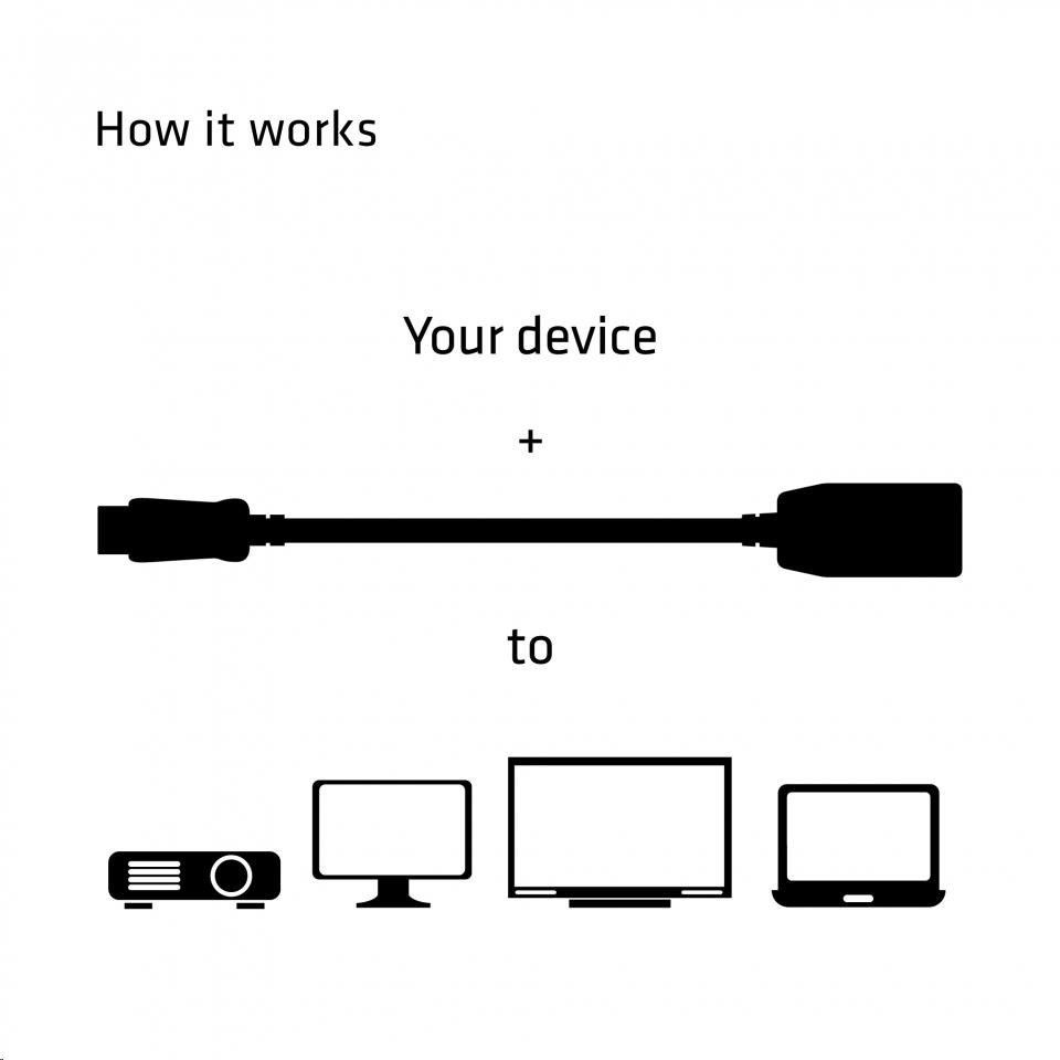 Adaptér podporuje grafické karty od AMD, Intel a Nvidia a maximálne rozlíšenie 1920x1200p. Jednoducho pripojte konektor DisplayPort ™ k počítaču a kábel HDMI ™ z displeja pripojte do adaptéru HDMI ™ (female). Inštalácia nevyžaduje inštaláciu softwaru. Obvody zabudované do adaptéru plynule prevádzajú video signál DisplayPort ™ do video signálu HDMI ™.