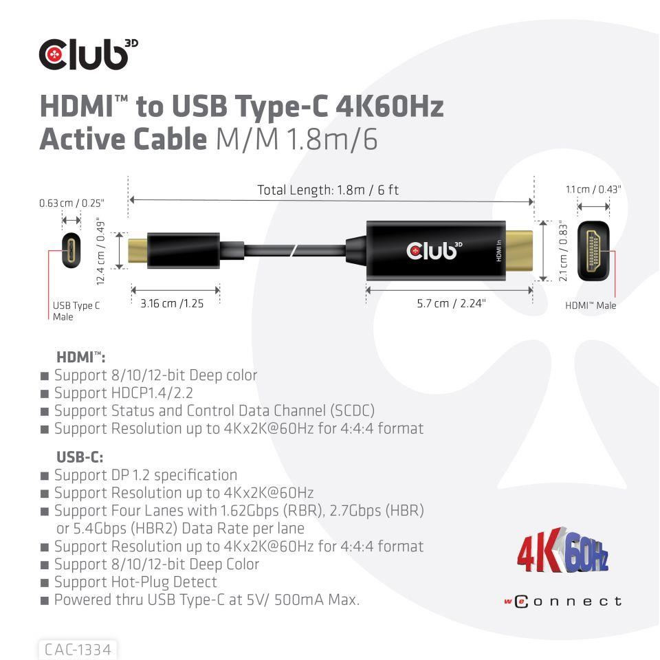 Club 3D CAC-1334 je aktívny kábel HDMI™ na USB-C, ktorý umožňuje prenášať signál zo zdroja HDMI™ (notebook, tablet, PC atď.) k zobrazovacím zariadeniam USB-C (TV, monitor, projektor atď.). Tento kábel je jednosmerný, funguje len zo zdrojového zariadenia HDMI™ do zariadenia USB C DP™ 1.2 Podporovaný alternatívny režim zobrazenia. Tento produkt podporuje DP™1.2 s rozlíšením až do 4096 x 2160@60 Hz.