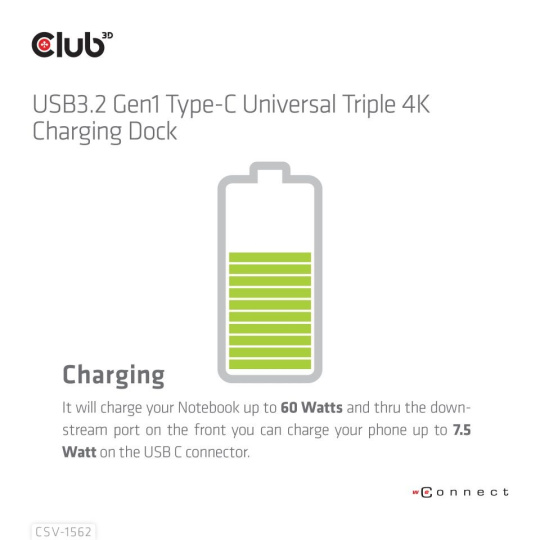 Prenosné počítače / ultrabooky / tablety majú často obmedzené možnosti pripojenia. Vďaka technológii PD Charging a funkcii nabíjania proti prúdu cez rozhranie USB typu C ponúka Club3D USB Type C Charging Dock jedinečné funkcie. Nabije váš notebook až do 60 W a cez nadväzujúci port na prednej strane môžete nabíjať telefón až do 7.5 W na konektore USB C.