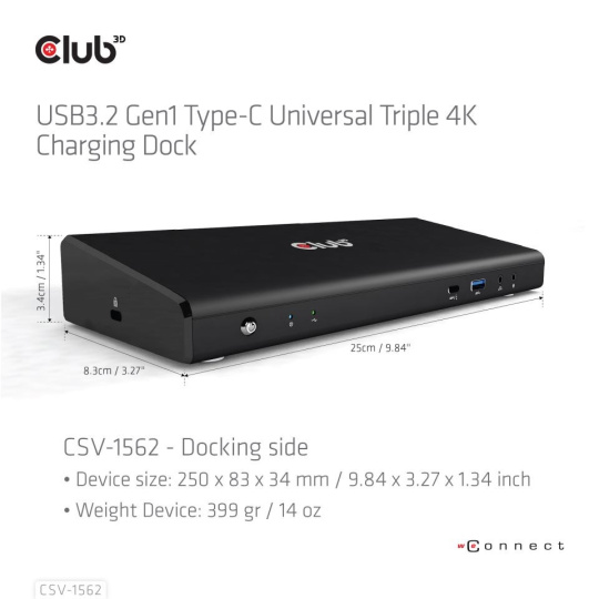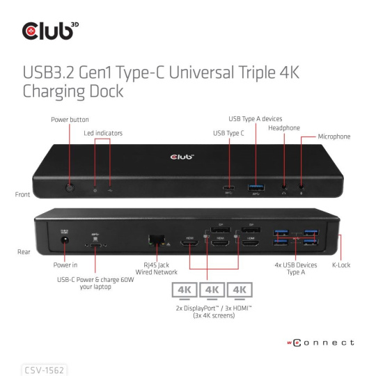 - Zámok Kensington?- Tlačidlo zapnutia/vypnutia na prednej strane Obsah balenia Club 3D CSV-1562 USB C 3.2 Univerzálny trojitý nabíjací dok 4K Gen1