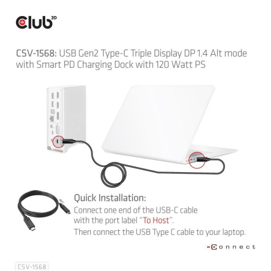 Club 3D CSV-1568 USB Gen2 Type-C Triple Display DP™ Alt mode + Smart PD Charging Dock so 120 W PSU je integrované riešenie, ktoré kombinuje video, dáta, napájanie, ethernet a zvuk. Má 4 videá (výstup 3 videí súčasne v režime MST) na prenos videa, 4 dátové porty USB (2 USB-A 10G, 1 Type-C 10G, 1 USB-A 5G) na prenos dát, 1 inteligentný nabíjací port USB-A na rýchle nabíjanie, 1 gigabitový ethernetový port na superrýchly ethernet, 2 audio porty (3.5 mm audio, Toslink) na počúvanie hudby. Okrem toho je táto dokovacia stanica vybavená dvojitým napájacím konektorom (nabíjanie PD typu C alebo 120W jednosmerný zdroj).