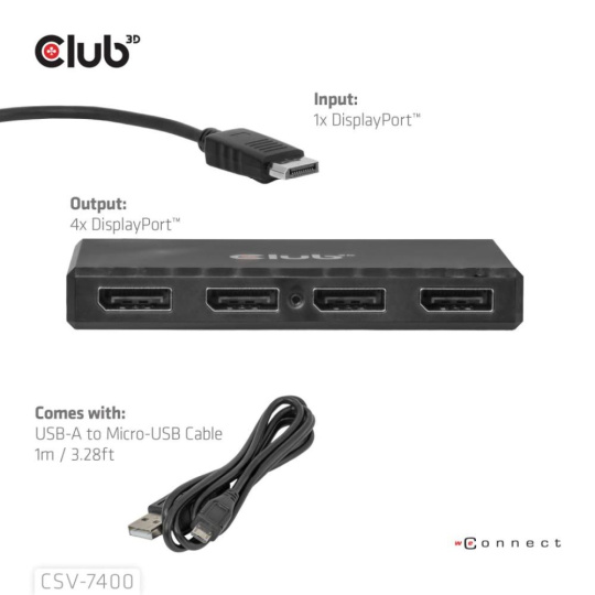 Club 3D CSV-7400 vám umožní pripojiť až štyri displeje z jedného DisplayPort zdroja. Podporuje súčasný výstup štyroch obrazoviek v rozlíšení 4K pri 30 Hz, vďaka čomu je ideálnym riešením pre multitasking, vyššiu produktivitu alebo rozšírený pracovný priestor.