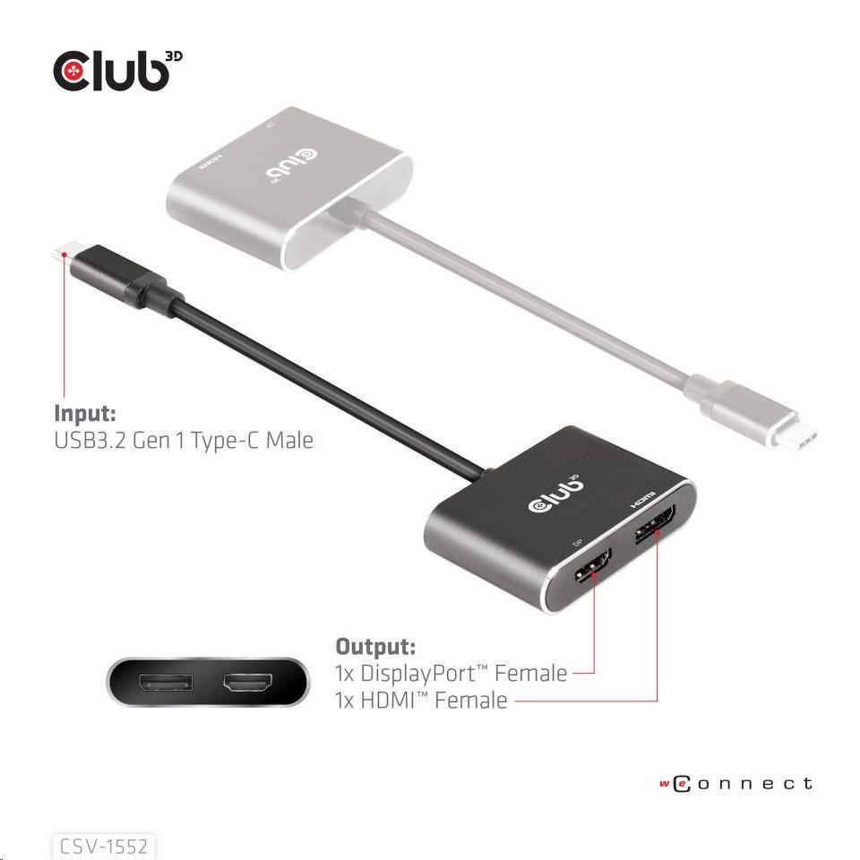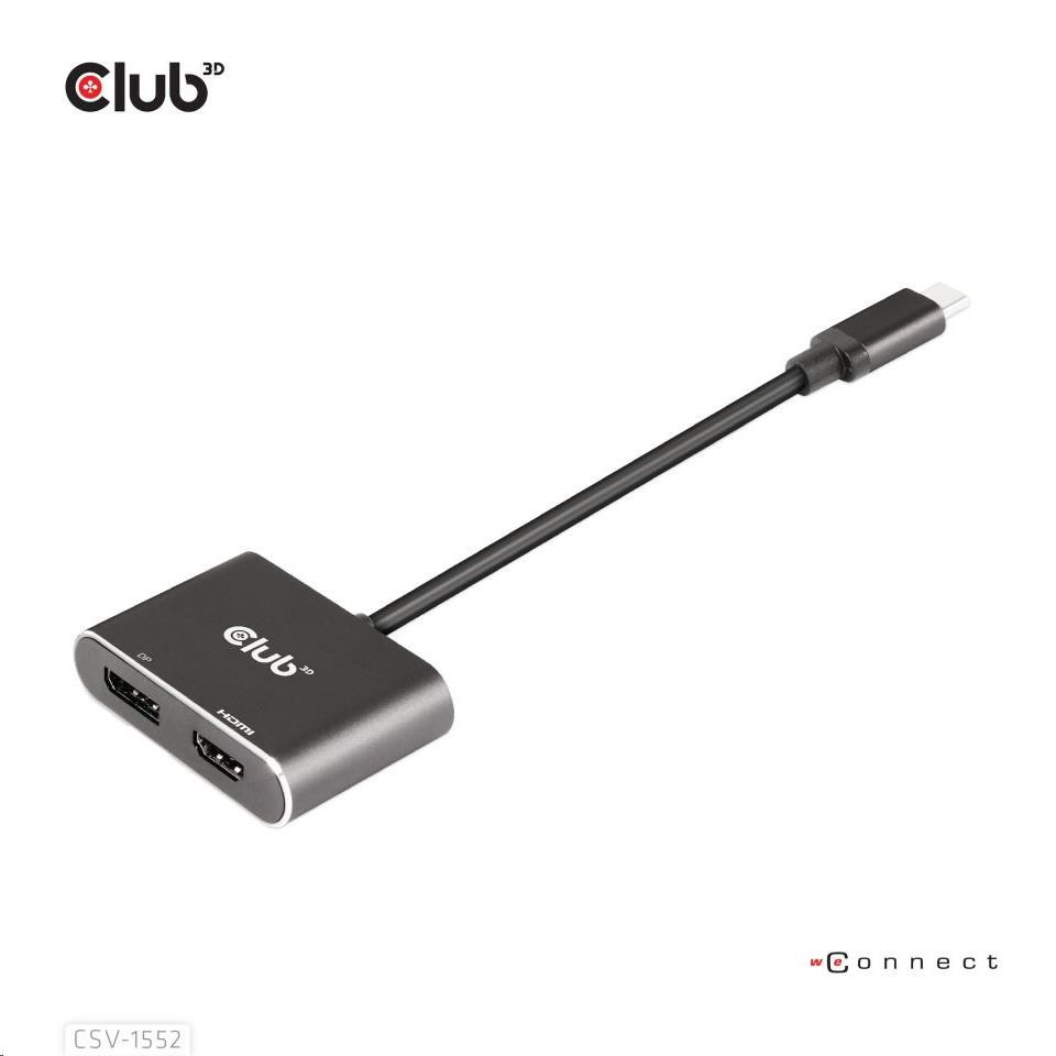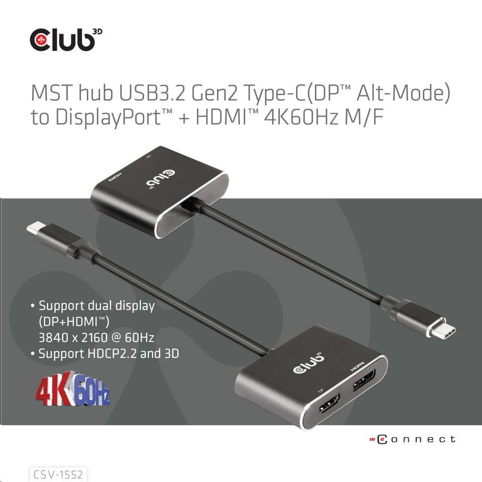 Club3D hub MST (Multi Stream Transport) USB3.2 Gen2 Type-C (DP Alt-Mode) na DisplayPort + HDMI 4K60Hz (M/F)
