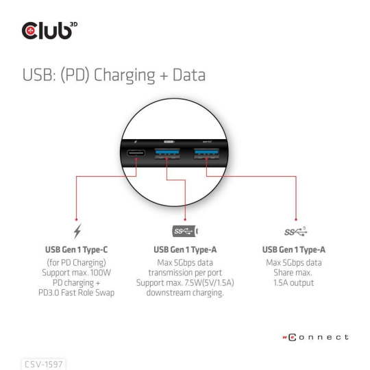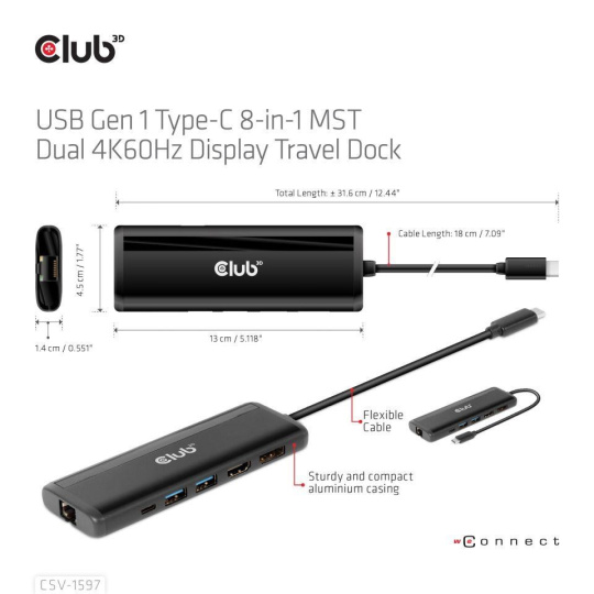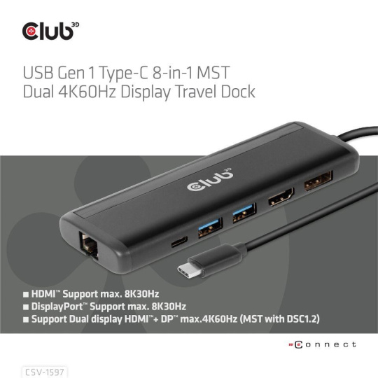 The Club 3D CSV-1597 USB Gen 1 Type-C 8-in-1 MST Dual 4K60Hz Display Travel Dock with HDMI™ 8K30Hz(HDR), DisplayPort™ 8K30Hz, 2x USB Gen 1 Type-A, BC1.2, RJ45, SD/Micro SD card slots and USB Gen 1 Type-C PD3.0 Female port, provides a very advanced, efficient solution to extend a single USB Gen 1 Type-C port to be multiple ports. It integrates video, data and power ports that allows to connect 2 displays simultaneously for enjoying videos on a larger screen, connect multiple USB Gen 1 devices for data transmission up to 5Gbps, connect a Gigabit Ethernet source for getting your PC connected to super high speed network, or connect to headset to enjoy fantastic music. It also provides PD charging for support up to max. 100W PD charging. This is for operating this device and charge the host simultaneously. It can work on all DP™1.4 Alt mode supported USB Gen 1 Type-C hosts.