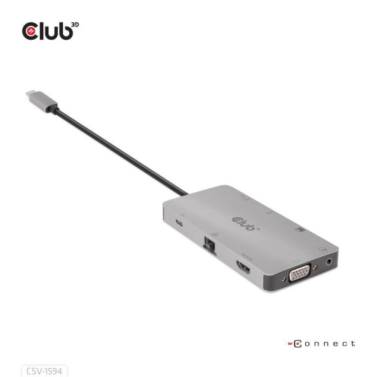 Rozbočovač Club 3D CSV-1594 USB Gen1 Type-C 9 v 1 s HDMI™, VGA, 2x USB Gen1 Type-A, RJ45, slotmi na karty SD/Micro SD a portom USB Gen1 Type-C Female predstavuje veľmi pokročilé a efektívne riešenie na rozšírenie jedného portu USB Gen1 Type-C na viac portov. Integruje video, dátové a napájacie porty, ktoré umožňujú pripojenie 2 displejov súčasne na sledovanie videí na väčšej obrazovke, pripojenie viacerých zariadení USB Gen1 na prenos dát rýchlosťou až 5 Gb/s, pripojenie zdroja Gigabit Ethernet na pripojenie počítača k superrýchlej sieti alebo pripojenie náhlavnej súpravy na počúvanie fantastickej hudby. Poskytuje tiež PD nabíjanie pre podporu až do max. 100W PD nabíjanie. Slúži na prevádzku tohto zariadenia a súčasné nabíjanie hostiteľa. Môže fungovať na všetkých DP™1.2 Podporované hostiteľské zariadenia USB Gen1 Type-C v režime Alt.