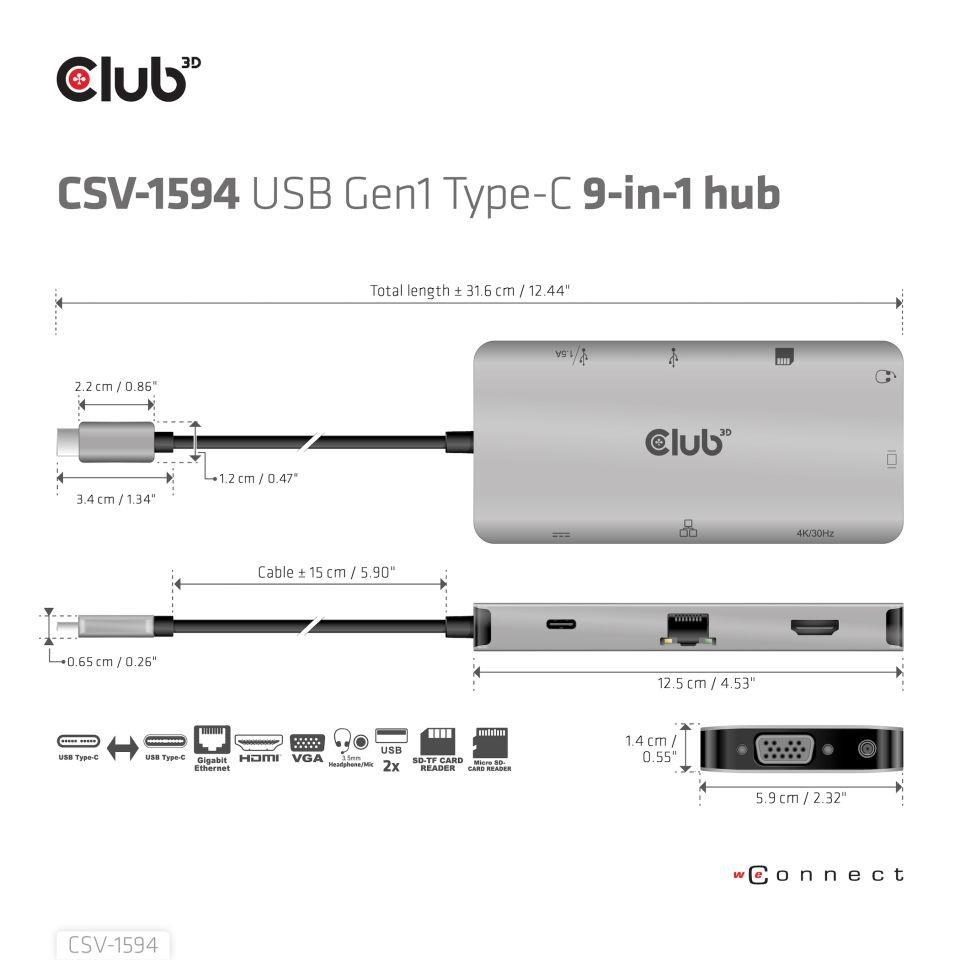 Rozbočovač Club 3D CSV-1594 USB Gen1 Type-C 9 v 1 s HDMI™, VGA, 2x USB Gen1 Type-A, RJ45, slotmi na karty SD/Micro SD a portom USB Gen1 Type-C Female predstavuje veľmi pokročilé a efektívne riešenie na rozšírenie jedného portu USB Gen1 Type-C na viac portov. Integruje video, dátové a napájacie porty, ktoré umožňujú pripojenie 2 displejov súčasne na sledovanie videí na väčšej obrazovke, pripojenie viacerých zariadení USB Gen1 na prenos dát rýchlosťou až 5 Gb/s, pripojenie zdroja Gigabit Ethernet na pripojenie počítača k superrýchlej sieti alebo pripojenie náhlavnej súpravy na počúvanie fantastickej hudby. Poskytuje tiež PD nabíjanie pre podporu až do max. 100W PD nabíjanie. Slúži na prevádzku tohto zariadenia a súčasné nabíjanie hostiteľa. Môže fungovať na všetkých DP™1.2 Podporované hostiteľské zariadenia USB Gen1 Type-C v režime Alt.