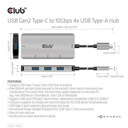 Club 3D CSV-1547 je rozbočovač USB Gen2 typu C na štyri porty USB typu A, ktorý pridáva štyri bežné porty USB typu A k vášmu zariadeniu s rozhraním USB typu C 10G na prenos dát a nabíjanie. Môže fungovať na akomkoľvek hostiteľovi typu C (PC, notebook, tablet, mobilný telefón atď.). Funguje so všetkými hlavnými operačnými systémami.