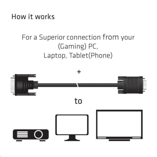 Na pripojenie k zariadeniam použite jeden z našich káblov VGA/DVI (predlžovací/adaptér): Ak potrebujete pomoc pri výbere správneho kábla, navštívte našu webovú stránku www.klub-3d.com alebo nám napíšte na support@club-3d.com a bude nám potešením vám pomôcť.