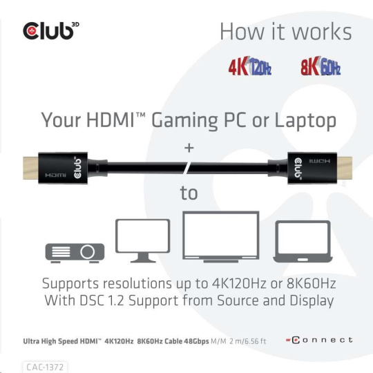 Club 3D CAC-1372 Ultra High Speed HDMI™2.1 Certifikovaný kábel je skonštruovaný tak, aby zvládol najvyššiu kvalitu video- a audio- signálov.