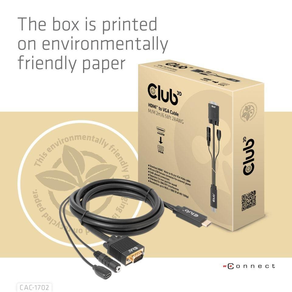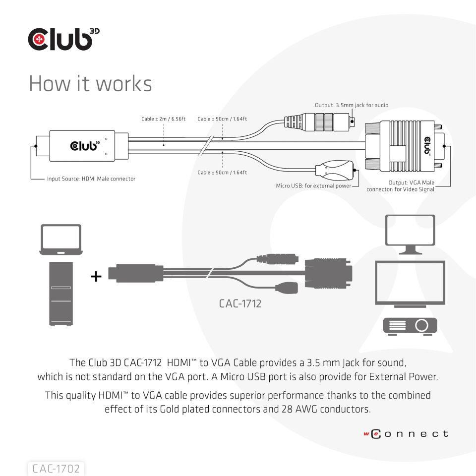 Club 3D CAC-1712 Kábel HDMI™ na VGA M/M 2 m/6.56ft 28AWG spája akýkoľvek stolný počítač, notebook alebo adaptér vybavený rozhraním HDMI™ s monitorom, displejom, žiaričom alebo projektorom s 15-pinovým portom VGA Female. Kábel je ideálny na použitie doma alebo v práci, vytvára spoľahlivé pripojenie na čokoľvek od hrania hier až po premietanie videa a podporuje rozlíšenie Full HD 1080p (max. rozlíšenie 1920 x 1080).