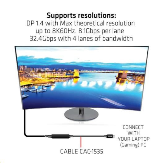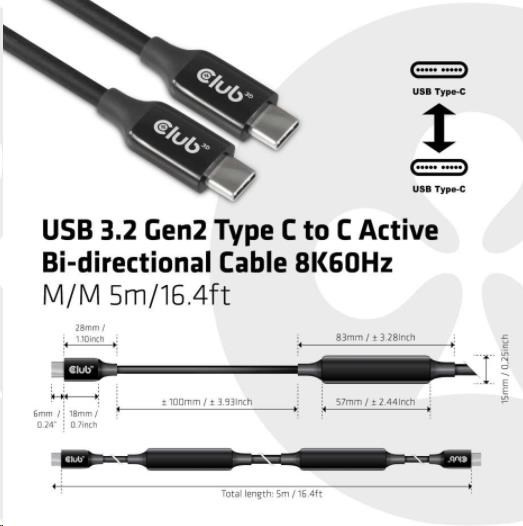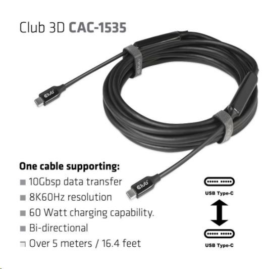 Club 3D CAC-1535 je obojsmerný aktívny kábel z USB typu C na USB typu C s čipovou sadou Re-timer na zlepšenie videa, dát a napájania, ktorý dosahuje dĺžku až 5 metrov/16.40ft . Pre video je kompatibilný s DP1.4 štandardov s teoretickým rozlíšením až 8K@60Hz. Pre dáta je kompatibilný s USB3.2 Gen 2 s maximálnou rýchlosťou prenosu dát 10 Gb/s a v prípade napájania je schopný dodať maximálne 60 W (20 V/3 A) PD Charging.